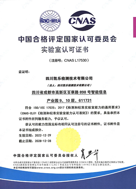凱樂檢測認證集團具備檢驗檢測機構資質認定(CMA)、實驗室認可(CNAS)資質,目前通過CMA的包括理化綜合、重金屬、農藥殘留有機物、獸藥殘留有機物、微生物、物理、輻射等檢測指標近4000項,涉及環境檢測領域的水和廢水、環境空氣和廢氣......